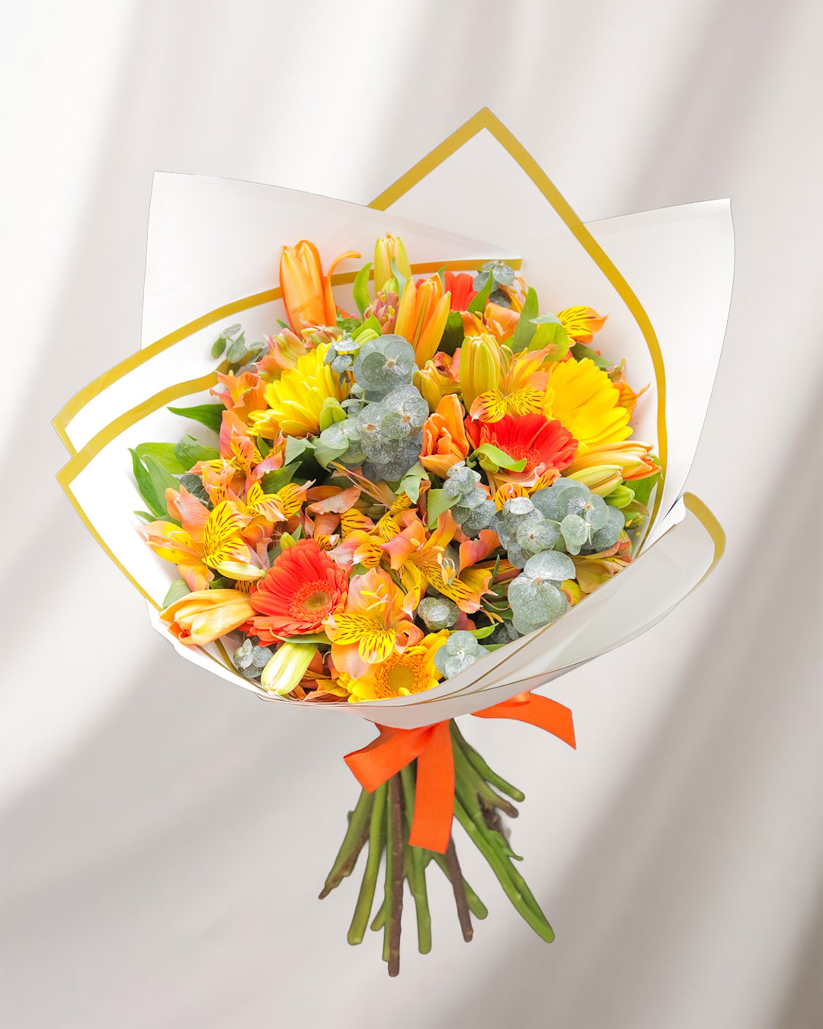 Descubra la perfección en cada detalle con nuestras flores naturales anaranjadas y amarillas, cuidadosamente seleccionadas para irradiar brillo y vitalidad. Este hermoso arreglo floral combina tonos cálidos y vivos que recuerdan los amaneceres dorados y la frescura de la naturaleza en su máxima expresión.