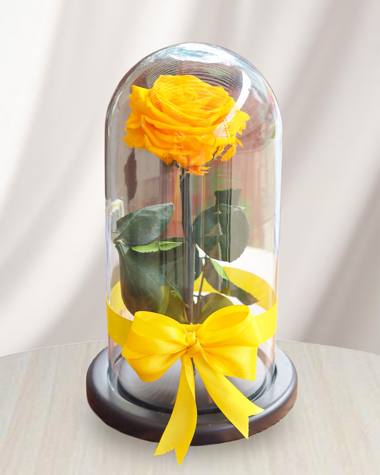 Esta rosa ha sido cuidadosamente conservada para mantener su frescura y color vibrante. El cristal que la envuelve actúa como un escudo protector, asegurando que la Rosa Eterna Amarilla siempre luzca impecable. El diseño transparente del cristal permite apreciar cada detalle de la flor, convirtiéndola en un objeto decorativo inolvidable para el hogar o la oficina.